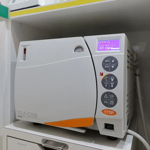 使用した器材は洗浄後、専用の消毒液に浸漬し、超音波洗 浄(血液、タンパク質の汚れを分解)した後、個別のパ ッケージに入れて、高圧滅菌(完全に無菌状態となり、使用 す る ま で こ の 状 態 を 保 つ )し ま す 。
